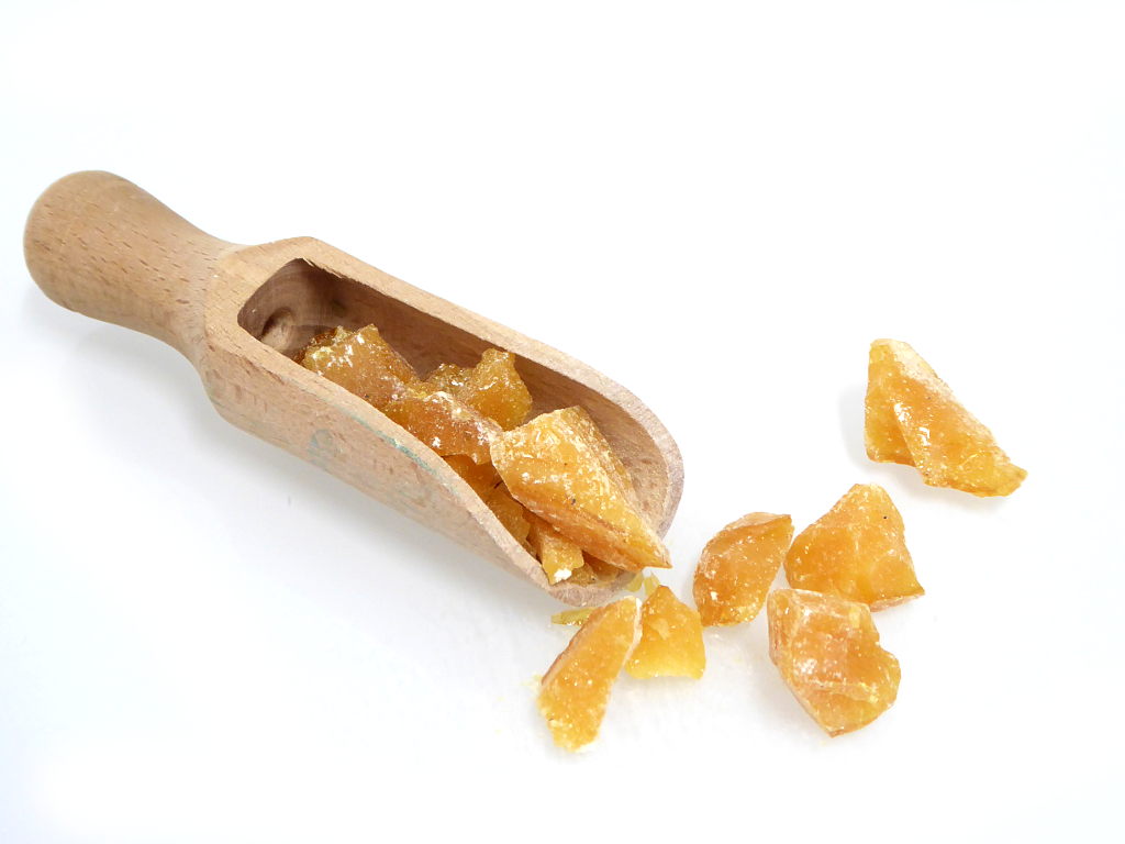 Geliefert wird das Harz in verschieden großen Stücken. Da es sehr weich ist, können Sie es problemlos mit der Hand zerbrechen oder in einem Mörser zerkleinern.