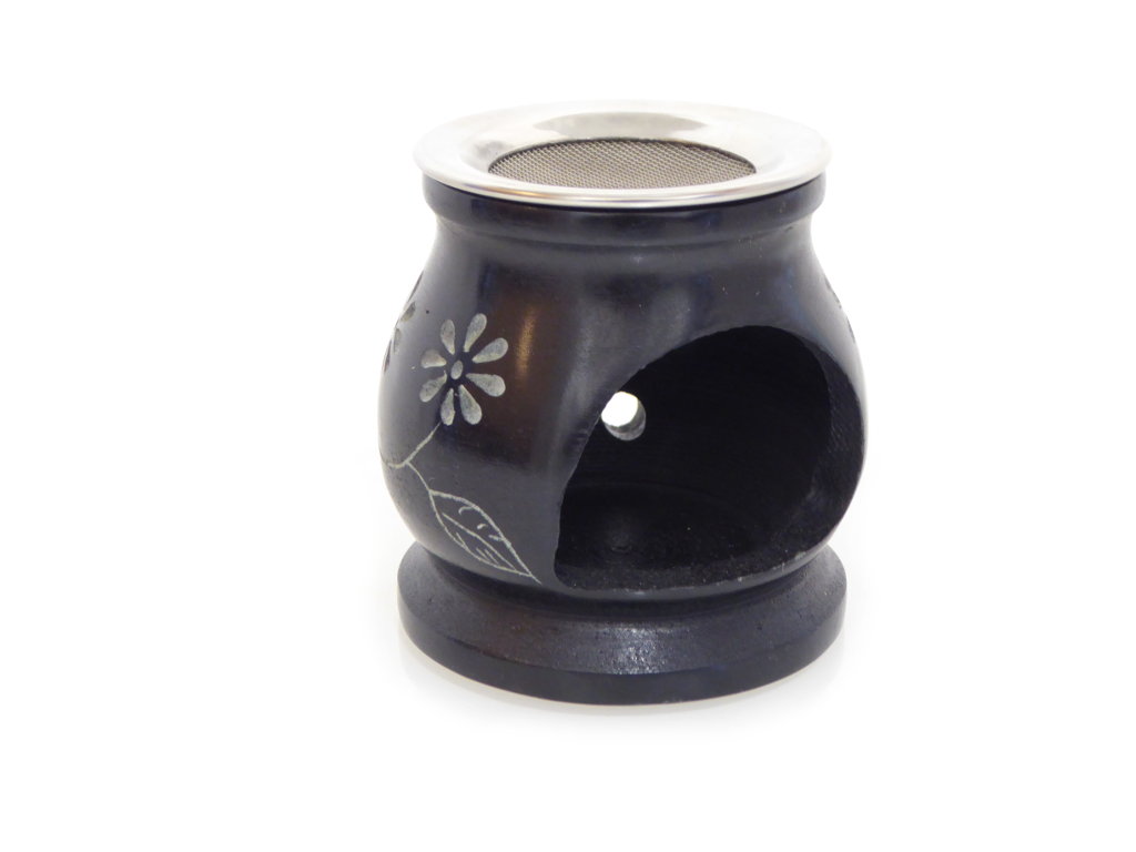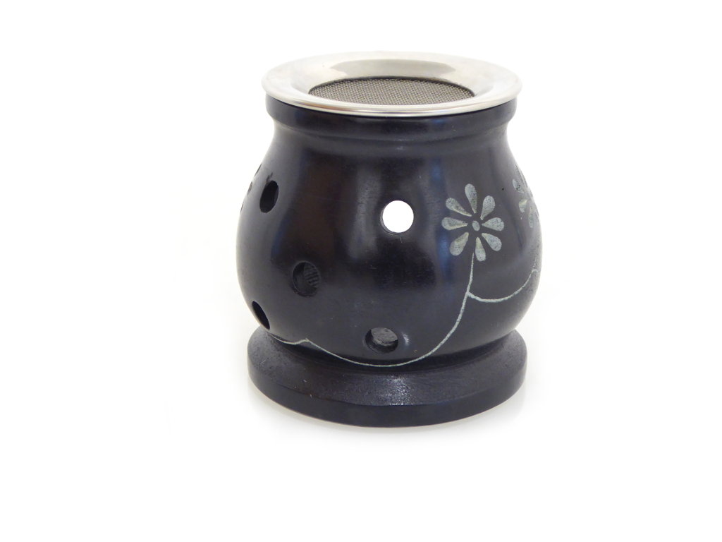 Ein kleines schwarzes Räucherstövchen aus Speckstein, welches liebevoll mit Blüten verziert ist. Auf der Rückseite fließen die Blütenstiele paarweise zueinander und bilden eine Einheit. Fünf Lüftungslöcher sorgen für eine dezente Lichtquelle. In Symbolik steht die Zahl „5“ u. a. auch für Liebe.