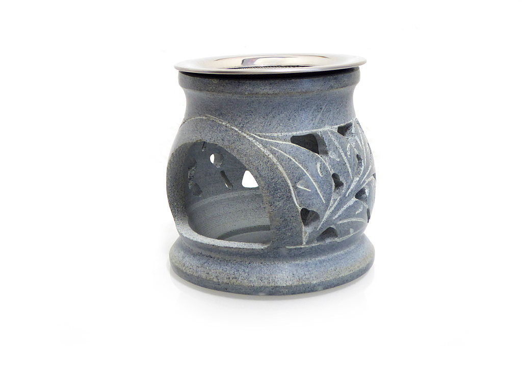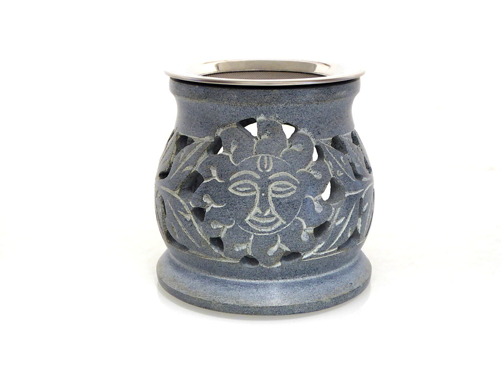 Modernes Räucherstövchen mit aufwendig ausgearbeiteter „Sonne“ and der Rückseite. Die seitlich ausgefrästen Rankenornamente fließen in die Sonne und bilden eine harmonische Einheit.